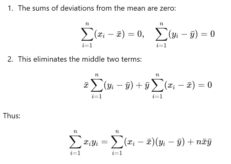Note that \( mn\bar{x}^2 \) and \( n\bar{x}^2 \) balance each other. Due to this we can drop them from the slope expression to make it more intuitive and focused on the relationship between the deviations o x and y from their respective means
