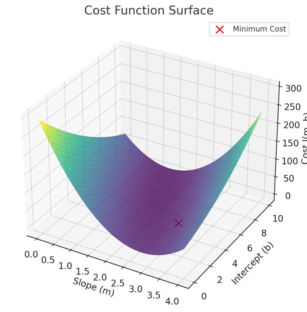 The cost function to minimize is the sum of squared errors between the observed (\(y_i\)) and predicted (\(\hat{y}_i\)) values: